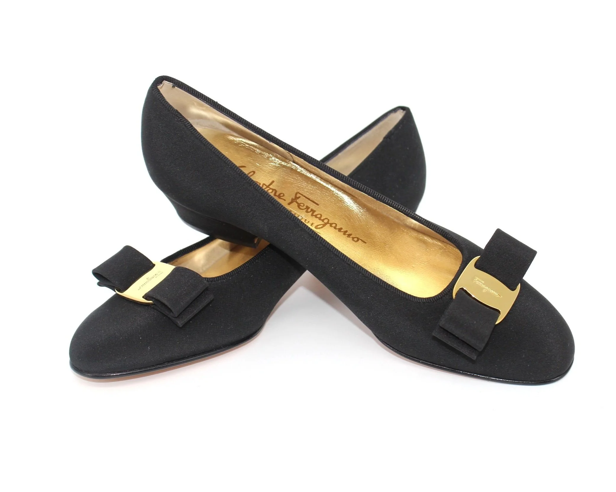 Black fabric featuring classic Ferragamo Vara bow with gold hardware. Heel height: 3cm. Made in Italy.